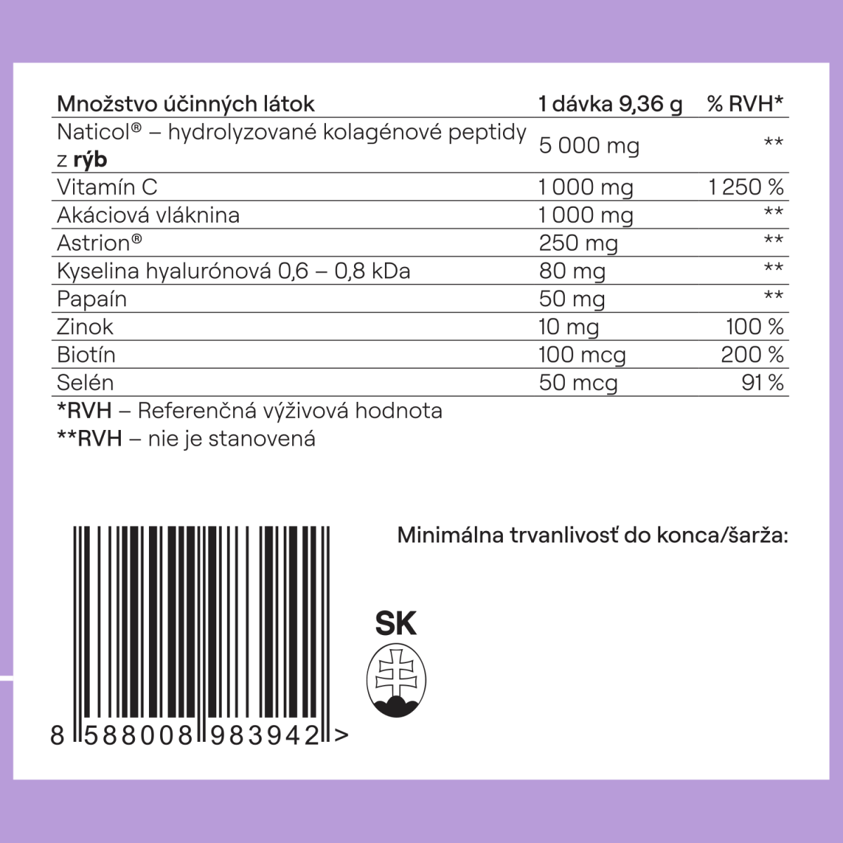 Klinickou štúdiou overená dávka kvalitného morského kolagénu Naticol®, ktorý má výbornú vstrebateľnosť a preukázaný, klinickými štúdiami overený efekt na pleť, vlasy a nechty - na spomalenie starnutia, redukciu vrások, zlepšenie hydratácie, pevnosti, pružnosti a jasu pokožky.